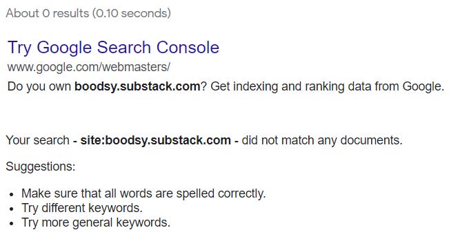 asked about search engines I did a quick check for her and entered the following search term in Google Search:The format is site:sitename with no spaces. You replace sitename with your own Substack address.